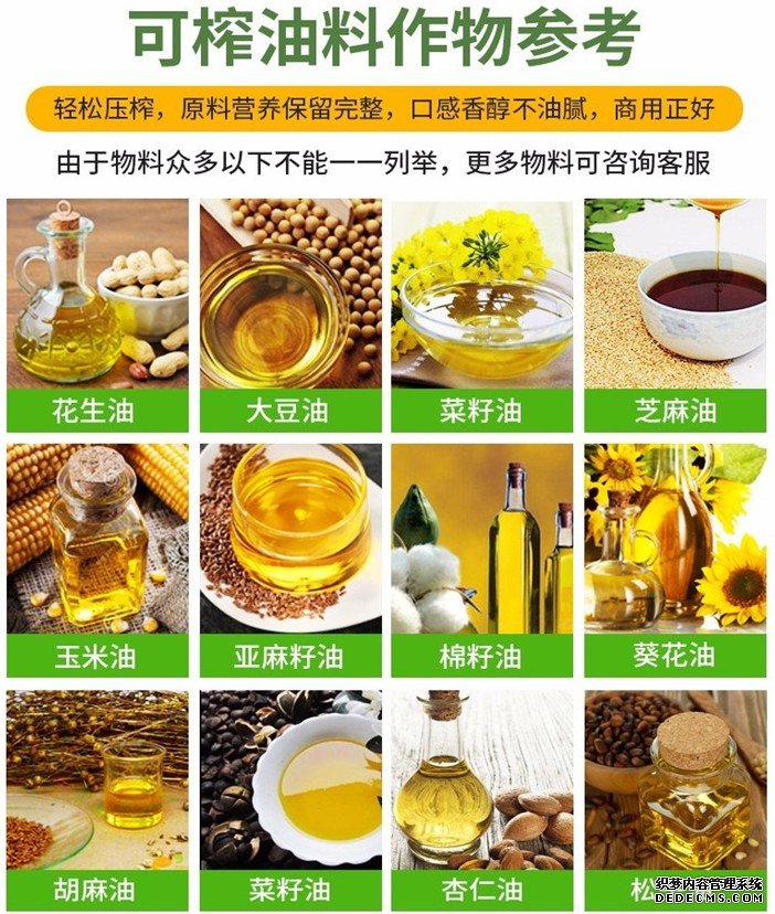 該設(shè)備可適用于菜籽、花生、茶籽、大豆、核桃、葵花籽等油料的生產(chǎn)加工,且壓榨出的油品綠色環(huán)保,對人體健康有益無害。購買此機(jī)后可長期穩(wěn)定作業(yè),對于中、小油廠和鄉(xiāng)鎮(zhèn)個(gè)體企業(yè)都很適用。